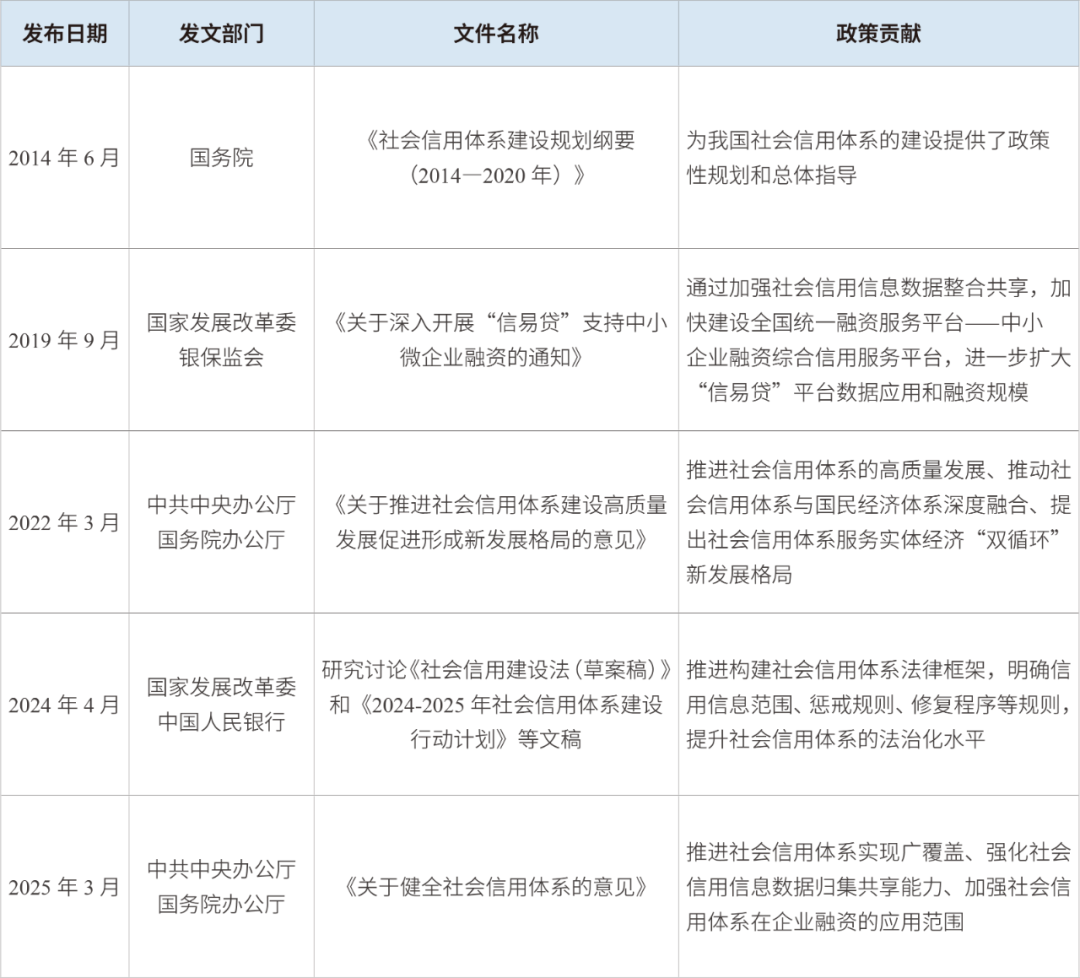 黨中央、國(guó)務(wù)院高度重視我國(guó)社會(huì)信用體系的建設(shè),陸續(xù)出臺(tái)了一系列相關(guān)政策文件以推動(dòng)社會(huì)信用體系的發(fā)展與推廣應(yīng)用,為社會(huì)信用體系在企業(yè)融資領(lǐng)域的有效應(yīng)用提供了強(qiáng)有力的政策支持和保障。