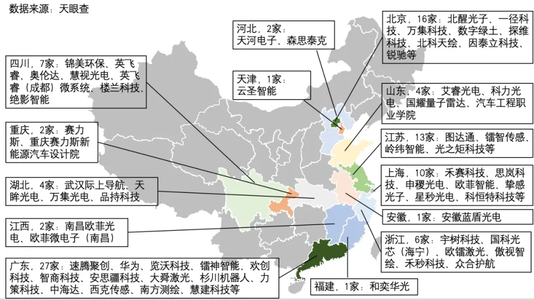 圖1 國(guó)內(nèi)主要省市激光雷達(dá)企業(yè)情況