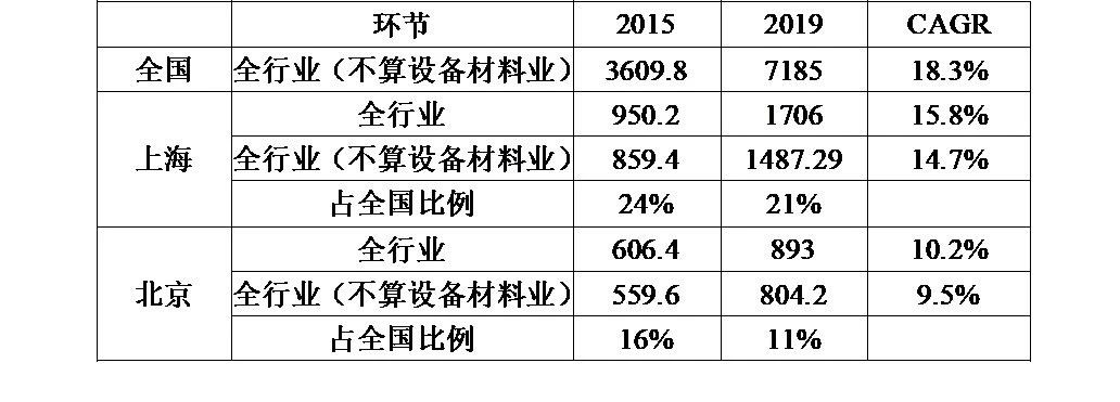 表2:2015-2019年上海及北京集成電路各產(chǎn)業(yè)環(huán)節(jié)的收入及增速