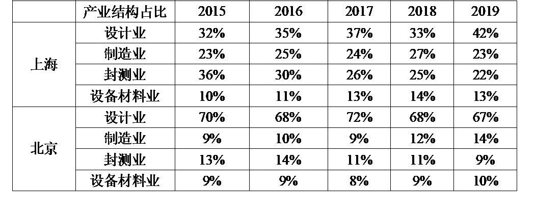 (2)產(chǎn)業(yè)結(jié)構(gòu)比較。從產(chǎn)業(yè)結(jié)構(gòu)來看,如表2所示,上海市集成電路產(chǎn)業(yè)機(jī)構(gòu)更為優(yōu)化和均衡。相比于2015年,上海集成電路設(shè)計(jì)業(yè)占比從32%提升到42%,強(qiáng)化了引領(lǐng)作用。而封測(cè)業(yè)從36%下降到22%,制造業(yè)和設(shè)備材料業(yè)占比保持相對(duì)穩(wěn)定,可以看出整體產(chǎn)業(yè)結(jié)構(gòu)的演進(jìn)是在逐步完善的。而北京的產(chǎn)業(yè)結(jié)構(gòu)相比之下略顯失衡,設(shè)計(jì)業(yè)從2015年占據(jù)70%下降到2019年的67%,而制造、封測(cè)、設(shè)備材料業(yè)均在10%左右,說明北京仍然面臨著產(chǎn)業(yè)各環(huán)節(jié)發(fā)展不均衡,具有明顯產(chǎn)業(yè)短板的問題。