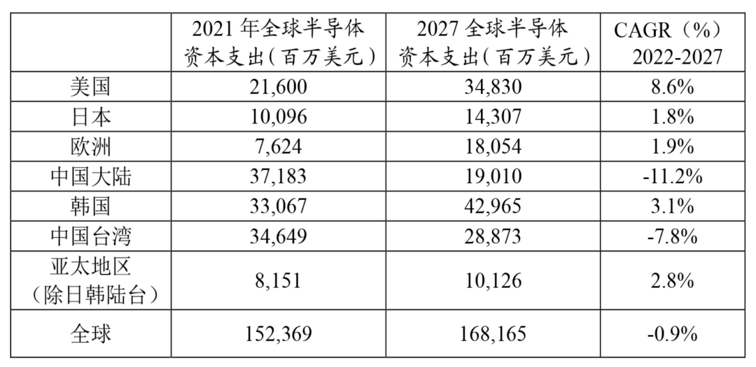 表2:2021-2027年全球半導體資本支出區(qū)域分布