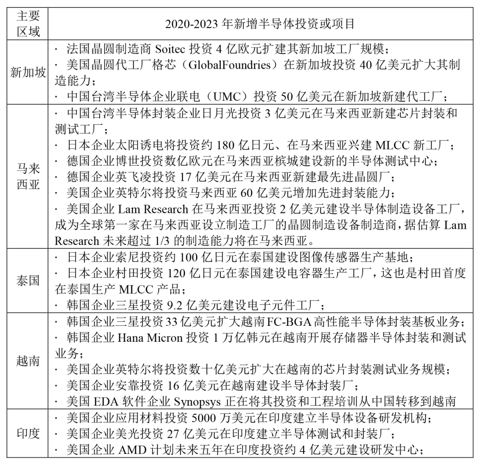全球半導體產(chǎn)業(yè)集中在美國、中國大陸、歐洲、日本、韓國和中國臺灣六大區(qū)域,據(jù)相關數(shù)據(jù)顯示,2022年六大區(qū)域半導體產(chǎn)值占比超過98%。而新加坡、馬來西亞等地,雖然也有半導體產(chǎn)業(yè)的布局,但普遍處于產(chǎn)業(yè)鏈中低端,例如全球15%-20%的被動元件產(chǎn)能布局在東南亞。近年來由于中美半導體貿易脫鉤加劇,國際地緣沖突等因素作用,進一步催化全球半導體產(chǎn)業(yè)鏈分流和遷移,新加坡、馬來西亞、泰國、越南和印度等半導體“二線”區(qū)域正從半導體行業(yè)的全球布局調整中受益匪淺。主要特征:①美國、歐洲等國家和地區(qū)企業(yè)均以提高供應鏈在面對國際地緣政治緊張局勢時的彈性為由,持續(xù)加大在新加坡等地的投資(見表3)。②根據(jù)Gartner的預測,2021-2027年亞太地區(qū)(除日韓、中國的大陸和臺灣地區(qū)外)的半導體產(chǎn)業(yè)收入的年均復合增速將超過中國臺灣、美國、歐洲、中國大陸、日韓等傳統(tǒng)半導體“一線”區(qū)域,成為未來5年全球增長最快的區(qū)域(見表4)。