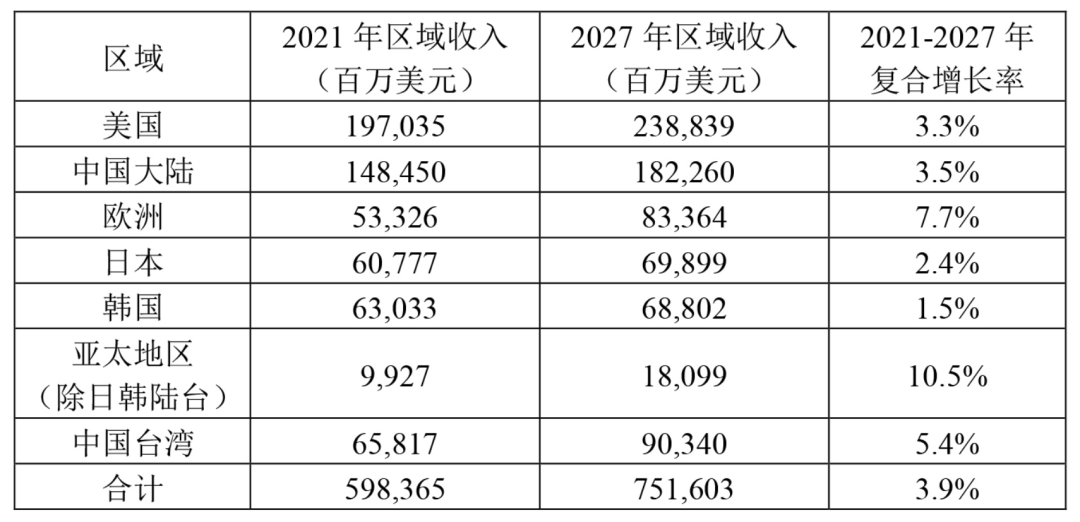 表4:2021-2027年全球半導體產(chǎn)業(yè)收入?yún)^(qū)域分布預估