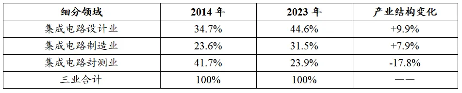 表1 2014-2023年我國(guó)集成電路產(chǎn)業(yè)三大主業(yè)產(chǎn)業(yè)結(jié)構(gòu)情況