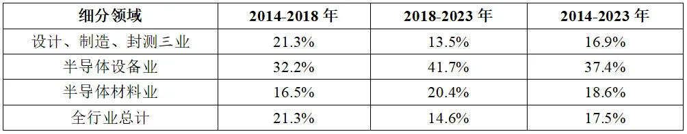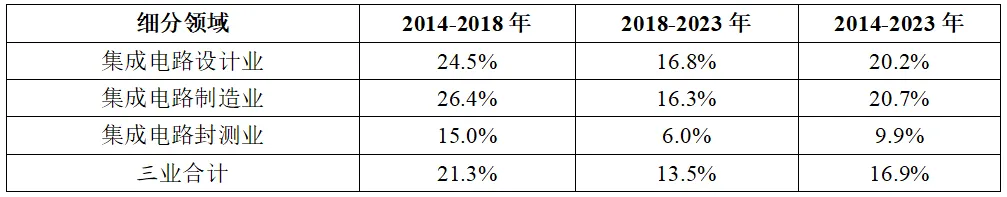 表2 2014-2023年我國(guó)集成電路產(chǎn)業(yè)三大主業(yè)銷售收入年均復(fù)合增速情況