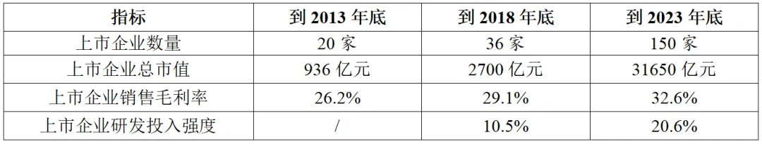 資本市場(chǎng)助力產(chǎn)業(yè)升級(jí),上市企業(yè)數(shù)量質(zhì)量雙飛躍。根據(jù)東方財(cái)富金融數(shù)據(jù)統(tǒng)計(jì)(表4),截止到2013年底,我國(guó)實(shí)現(xiàn)A股上市的半導(dǎo)體企業(yè)僅有20家,總市值不足千億元,平均銷售毛利率26.2%。而到2023年底,上市企業(yè)數(shù)量超過(guò)150家,總市值超過(guò)3萬(wàn)億元,平均銷售毛利率32.6%。尤其是2018-2023年,由于科創(chuàng)板的設(shè)立,帶動(dòng)集成電路產(chǎn)業(yè)在資本市場(chǎng)實(shí)現(xiàn)“加速跑”,5年間上市企業(yè)數(shù)量和總市值分別實(shí)現(xiàn)超過(guò)4倍和10倍的增長(zhǎng),上市企業(yè)平均銷售毛利率和研發(fā)投入強(qiáng)度也實(shí)現(xiàn)大幅躍升。