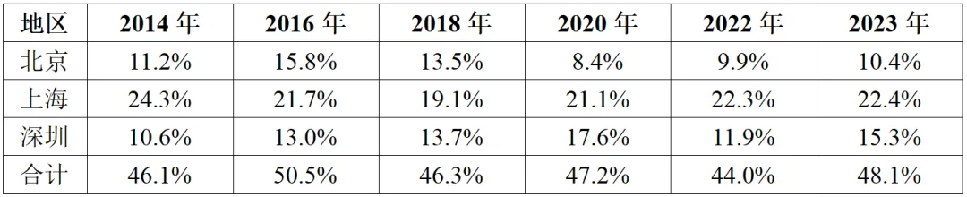 表6 2014-2023年北京、上海、深圳集成電路設(shè)計(jì)、制造、封測(cè)三大主業(yè)銷售收入占全國(guó)比重情況