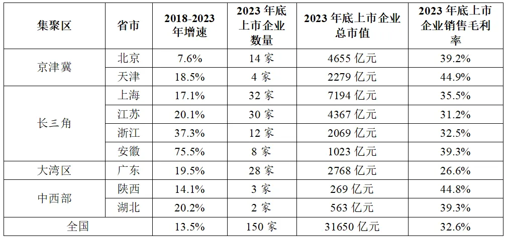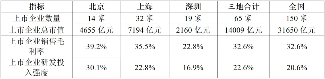 在企業(yè)發(fā)展方面,北京上市企業(yè)發(fā)展質(zhì)量最高,上海上市企業(yè)數(shù)量和總市值最多。根據(jù)東方財(cái)富數(shù)據(jù)(表7),截止到2023年底,北京、上海、深圳分別擁有14家、32家、19家半導(dǎo)體領(lǐng)域的上市企業(yè),總市值分別為4655億元、7194億元、2160億元,合計(jì)上市企業(yè)數(shù)量和總市值占到全國(guó)的40%以上。其中上海上市企業(yè)的數(shù)量和總市值最多,而北京的上市企業(yè)發(fā)展質(zhì)量最高,銷售毛利率和研發(fā)投入強(qiáng)度分別達(dá)到39.2%和30.1%,遠(yuǎn)超全國(guó)平均水平。