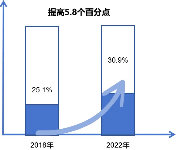從增加值看,2018年全市高精尖產(chǎn)業(yè)實現(xiàn)增加值7610.3億元,占地區(qū)生產(chǎn)總值比重為25.1%;2022年全市高精尖產(chǎn)業(yè)實現(xiàn)增加值12857.8億元,占地區(qū)生產(chǎn)總值比重達(dá)到30.9%[2],較2018年提高5.8個百分點(diǎn)。