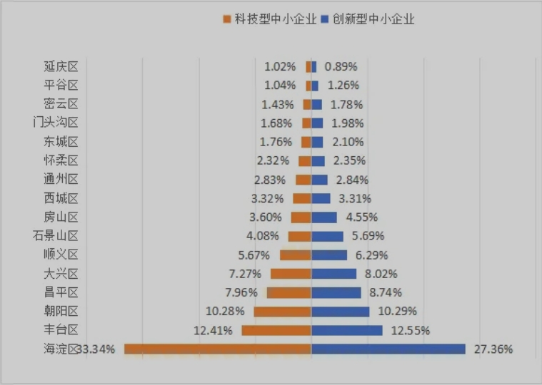 圖1 北京市科技型中小企業(yè)和創(chuàng)新型中小企業(yè)區(qū)域分布 2.兩類企業(yè)培育導(dǎo)向基本一致,創(chuàng)新型中小企業(yè)指標(biāo)體系覆蓋面更廣。 科技型中小企業(yè)和創(chuàng)新型中小企業(yè)的評價(jià)指標(biāo)均關(guān)注企業(yè)研發(fā)創(chuàng)新活動(dòng)、研發(fā)成果產(chǎn)出情況,在研發(fā)投入、知識產(chǎn)權(quán)產(chǎn)出上分別設(shè)置計(jì)分指標(biāo)??萍紕?chuàng)新型中小企業(yè)在研發(fā)活動(dòng)上設(shè)置科技人員指標(biāo),考核科技人員占企業(yè)職工總數(shù)的比例,更聚焦于企業(yè)本身在研發(fā)活動(dòng)上的要素投入。創(chuàng)新型中小企業(yè)同時(shí)要考核企業(yè)的成長性和專業(yè)度,對企業(yè)主營業(yè)務(wù)收入、資產(chǎn)負(fù)債率、主導(dǎo)產(chǎn)品所屬領(lǐng)域和產(chǎn)生收入占比情況設(shè)置計(jì)分指標(biāo)。 這種差異從直通指標(biāo)設(shè)置中也可體現(xiàn),兩類企業(yè)如獲得高級別科技獎(jiǎng)勵(lì)、擁有其他科技創(chuàng)新類企業(yè)資質(zhì)、成立省部級研發(fā)機(jī)構(gòu)均可獲得直通資格。不同的是,對將先進(jìn)技術(shù)轉(zhuǎn)化為標(biāo)準(zhǔn)、在市場形成一定自我保護(hù)壁壘的中小企業(yè)設(shè)置給予科技型中小企業(yè)稱號“直通車”資格(主導(dǎo)制定過國際標(biāo)準(zhǔn)、國家標(biāo)準(zhǔn)或行業(yè)標(biāo)準(zhǔn)),對在資本市場獲得了認(rèn)可的、擁有一定資本實(shí)力的中小企業(yè)可獲得創(chuàng)新型中小企業(yè)稱號“直通車”資格(近三年內(nèi)新增股權(quán)融資總額(合格機(jī)構(gòu)投資者的實(shí)繳額)500萬元以上)。 3.兩類企業(yè)創(chuàng)新目的不同,在創(chuàng)新能力和產(chǎn)業(yè)支撐方面各有側(cè)重。 科技型中小企業(yè)更多考慮處于研發(fā)階段且暫未形成一定經(jīng)濟(jì)收入的企業(yè),如在研發(fā)費(fèi)用投入上設(shè)置二選一靈活指標(biāo),企業(yè)可自行選擇研發(fā)費(fèi)用與銷售收入和成本費(fèi)用支出相比較取得優(yōu)勢指標(biāo)。在科研人員上的關(guān)注同樣體現(xiàn)出科技型中小企業(yè)對研發(fā)投入上的傾斜,不僅要求企業(yè)投入更多的研發(fā)資金,在科研人員力量配備上也同步提出要求并作為門檻條件(科技人員指標(biāo)得分不得為0分)的強(qiáng)制要求,體現(xiàn)科技型中小企業(yè)的研發(fā)屬性。創(chuàng)新型中小企業(yè)僅設(shè)置了研發(fā)費(fèi)占營業(yè)收入比例這一個(gè)選項(xiàng)。 在科技創(chuàng)新成果產(chǎn)出方面,對于企業(yè)獲得知識產(chǎn)權(quán)情況,科技型中小企業(yè)根據(jù)獲得Ⅱ類知識產(chǎn)權(quán)數(shù)據(jù)可在此項(xiàng)指標(biāo)中得到20%—80%的分?jǐn)?shù),1項(xiàng)I類知識產(chǎn)權(quán)即可獲得滿分,對處于研發(fā)期的中小企業(yè)更加友好,而創(chuàng)新型中小企業(yè)如僅Ⅱ類知識產(chǎn)權(quán),僅可獲得12.5%的分?jǐn)?shù),無關(guān)數(shù)量,想取得更高分?jǐn)?shù)需要獲得更高價(jià)值專利,如高價(jià)值I類專利或者自主研發(fā)的I類知識產(chǎn)權(quán)。同時(shí)認(rèn)定企業(yè)所屬產(chǎn)業(yè)為新一代信息技術(shù)、生物、高端裝備制造、新能源、新材料等戰(zhàn)略新興產(chǎn)業(yè)且已初具規(guī)模形成較好的經(jīng)濟(jì)收益,對企業(yè)能否支撐產(chǎn)業(yè)發(fā)展有更高的要求。 4.兩類企業(yè)培育路徑均呈“階梯型”,主管部門職責(zé)不同影響資源配置效率和效果。 創(chuàng)新型中小企業(yè)是工業(yè)和信息化部優(yōu)質(zhì)中小企業(yè)梯度培育的第一級,也是企業(yè)走“專精特新”之路的第一步,企業(yè)資質(zhì)認(rèn)定后即正式進(jìn)入梯度培育體系,沿著“創(chuàng)新型中小企業(yè)—專精特新企業(yè)—國家小巨人企業(yè)-隱形冠軍/單項(xiàng)冠軍”道路發(fā)展??萍夹椭行∑髽I(yè)同樣可看作科學(xué)技術(shù)部的對于科技型企業(yè)培育工作的第一級,企業(yè)按照“科技型中小企業(yè)—高新企業(yè)—獨(dú)角獸企業(yè)”階梯向上發(fā)展。 根據(jù)現(xiàn)有政策和培育體系,兩者在“攀爬”階梯過程中,每升一級都可獲得更加精準(zhǔn)、適合和力度更強(qiáng)的發(fā)展支撐,通過分析近年來針對兩類企業(yè)出臺(tái)的政策,在知識產(chǎn)權(quán)、人才引進(jìn)、研發(fā)及成果轉(zhuǎn)化、數(shù)智轉(zhuǎn)型和金融支持上均有支持,對于能提供培育資源的載體,如孵化器之于科技型中小企業(yè),示范平臺(tái)及示范基地、專精特新工作站、專精特新園區(qū)之于創(chuàng)新型中小企業(yè),均有相關(guān)政策或資金支持??萍夹椭行∑髽I(yè)獨(dú)有的研發(fā)費(fèi)用加計(jì)扣除、延長虧損結(jié)轉(zhuǎn)年限等政策和創(chuàng)新型中小企業(yè)后續(xù)可享受的上市融資、品牌培育、融鏈補(bǔ)鏈等政策的獨(dú)有性,也根據(jù)認(rèn)定主管部門的自身職責(zé)提供政策支持。 5.兩類企業(yè)在產(chǎn)業(yè)鏈融通中均具有重要的支撐作用,但扮演角色和融鏈環(huán)節(jié)不同。 科技型中小企業(yè)與創(chuàng)新型中小企業(yè)在企業(yè)融通中均體現(xiàn)出重要的支撐作用,科技型中小企業(yè)功能聚焦在研發(fā)創(chuàng)