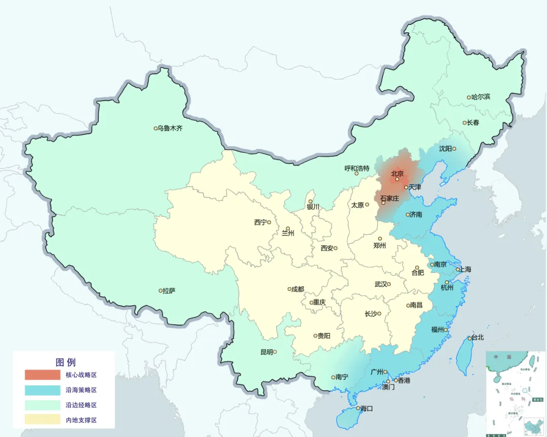 核心戰(zhàn)略區(qū):北京、天津、河北(雄安);沿海策略區(qū):遼寧、山東、江蘇、上海、浙江、福建、廣東、廣西、海南、香港、澳門(mén)、臺(tái)灣;沿邊經(jīng)略區(qū):廣西、云南、西藏、新疆、內(nèi)蒙古、黑龍江、吉林、遼寧;內(nèi)地支撐區(qū):貴州、重慶、四川、青海、甘肅、寧夏、陜西、山西、河南、湖北、安徽、江西、湖南。