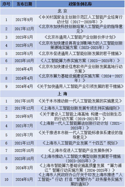 一、上海、北京發(fā)布人工智能產(chǎn)業(yè)政策數(shù)量領(lǐng)先,上海政策類型最為豐富