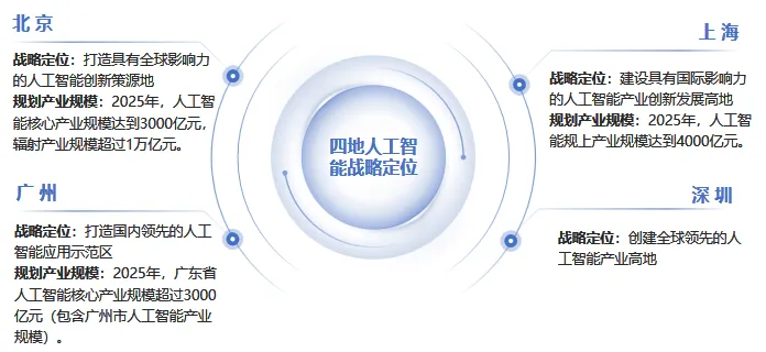 北上廣深四地均將發(fā)展人工智能作為重要戰(zhàn)略,聚焦打造國(guó)內(nèi)領(lǐng)先、國(guó)際一流的人工智能產(chǎn)業(yè)高地,通過(guò)政策體系引領(lǐng),推動(dòng)人工智能高質(zhì)量發(fā)展、各領(lǐng)域全方位應(yīng)用。北京市致力打造具有全球影響力的人工智能創(chuàng)新策源地,規(guī)劃2025年人工智能核心產(chǎn)業(yè)規(guī)模突破3000億元,帶動(dòng)形成超萬(wàn)億元的產(chǎn)業(yè)規(guī)模。上海市聚焦構(gòu)筑具有國(guó)際影響力的人工智能產(chǎn)業(yè)創(chuàng)新發(fā)展高地,規(guī)劃到2025年實(shí)現(xiàn)4000億元的人工智能規(guī)上產(chǎn)業(yè)規(guī)模。廣州市旨在建設(shè)國(guó)內(nèi)領(lǐng)先的人工智能應(yīng)用示范區(qū)。深圳市積極打造全球領(lǐng)先的人工智能產(chǎn)業(yè)高地,努力創(chuàng)建人工智能先鋒城市。