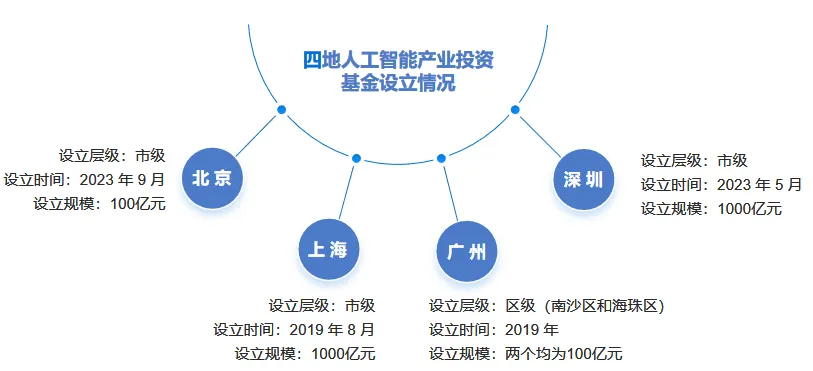 四地均設(shè)立了不同規(guī)模的產(chǎn)業(yè)基金,支持人工智能產(chǎn)業(yè)能級(jí)提升、企業(yè)方陣壯大。具體來(lái)看,北京、上海和深圳三地設(shè)立市級(jí)人工智能產(chǎn)業(yè)投資基金,廣州市設(shè)立區(qū)級(jí)人工智能產(chǎn)業(yè)基金(南沙區(qū)和海珠區(qū))。設(shè)立時(shí)間上,上海市最早于2019年8月設(shè)立首期100億元的產(chǎn)業(yè)基金,深圳、北京兩地均于2023年設(shè)立?;鹨?guī)模上,上海、深圳兩地人工智能產(chǎn)業(yè)基金規(guī)模遙遙領(lǐng)先,均達(dá)到1000億元。