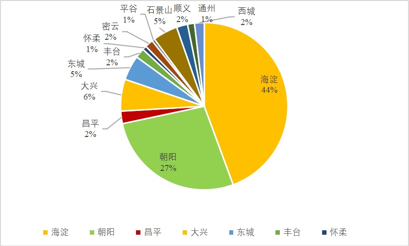 圖1 2019-2022年北京市數(shù)字經(jīng)濟(jì)增加值及占GDP比重 (二)創(chuàng)新上成效顯著 北京市高度重視創(chuàng)新,平臺經(jīng)濟(jì)領(lǐng)域的創(chuàng)新投入逐年增長,并形成一批創(chuàng)新成果。一是平臺企業(yè)研發(fā)投入強(qiáng)度加大。2022年北京市平臺企業(yè)研發(fā)投入強(qiáng)度約15%,遠(yuǎn)高于全市研發(fā)經(jīng)費(fèi)投入強(qiáng)度6%的水平。其中,信息資訊類平臺、社交娛樂類平臺、計(jì)算應(yīng)用類平臺等研發(fā)投入強(qiáng)度超20%。二是平臺企業(yè)在5G、大數(shù)據(jù)、云操作系統(tǒng)、分布式數(shù)據(jù)庫、區(qū)塊鏈、智能算法、金融科技等領(lǐng)域積極進(jìn)行核心關(guān)鍵技術(shù)研發(fā)并開展前沿技術(shù)探索,上線首個超導(dǎo)量子計(jì)算云平臺,發(fā)布國內(nèi)首個自主可控區(qū)塊鏈平臺“長安鏈”。部分領(lǐng)先企業(yè)發(fā)揮“頭雁效應(yīng)”,參與建設(shè)算力等新型基礎(chǔ)設(shè)施,推動自主技術(shù)規(guī)?;瘧?yīng)用。如抖音成立人工智能實(shí)驗(yàn)室,集中研究機(jī)器學(xué)習(xí)、自然語言處理、計(jì)算機(jī)視覺、人機(jī)交互等前沿技術(shù);百度推出云端全功能AI芯片“百度昆侖”及元宇宙產(chǎn)品“希壤”,以VR技術(shù)為基礎(chǔ),為行業(yè)提供云智一體的元宇宙基礎(chǔ)設(shè)施平臺。 (三)空間上集聚發(fā)展 統(tǒng)計(jì)數(shù)據(jù)顯示,北京市重點(diǎn)監(jiān)測平臺企業(yè)集聚在海淀區(qū)及朝陽區(qū),兩區(qū)合計(jì)占比超七成。從企業(yè)數(shù)量看,海淀區(qū)集聚抖音、快手、百度、美團(tuán)、貝殼、58、愛奇藝、新浪等多家頭部平臺企業(yè),占全部監(jiān)測平臺企業(yè)的44%以上;朝陽區(qū)集聚阿里、美團(tuán)、58、360等多家頭部互聯(lián)網(wǎng)平臺企業(yè),占全部監(jiān)測平臺企業(yè)的27%以上。此外,大興區(qū)集聚京東、本來生活、小笨鳥跨境平臺等企業(yè),占全部監(jiān)測平臺企業(yè)的6%以上,形成電商企業(yè)集聚發(fā)展帶動產(chǎn)業(yè)的創(chuàng)新格局。從涵蓋領(lǐng)域看,北京平臺經(jīng)濟(jì)主要分布在出行服務(wù)、電子商務(wù)、生活服務(wù)、游戲動漫、信息資訊、教育培訓(xùn)、金融、科技等領(lǐng)域,基本涵蓋網(wǎng)絡(luò)銷售類平臺、生活服務(wù)類平臺、社交娛樂類平臺、信息資訊類平臺、金融服務(wù)類平臺、計(jì)算應(yīng)用類平臺等六大類型。
