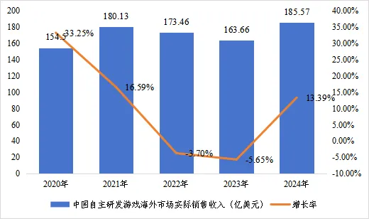 圖 1 近五年中國自主研發(fā)游戲海外市場實(shí)際銷售收入及增速
