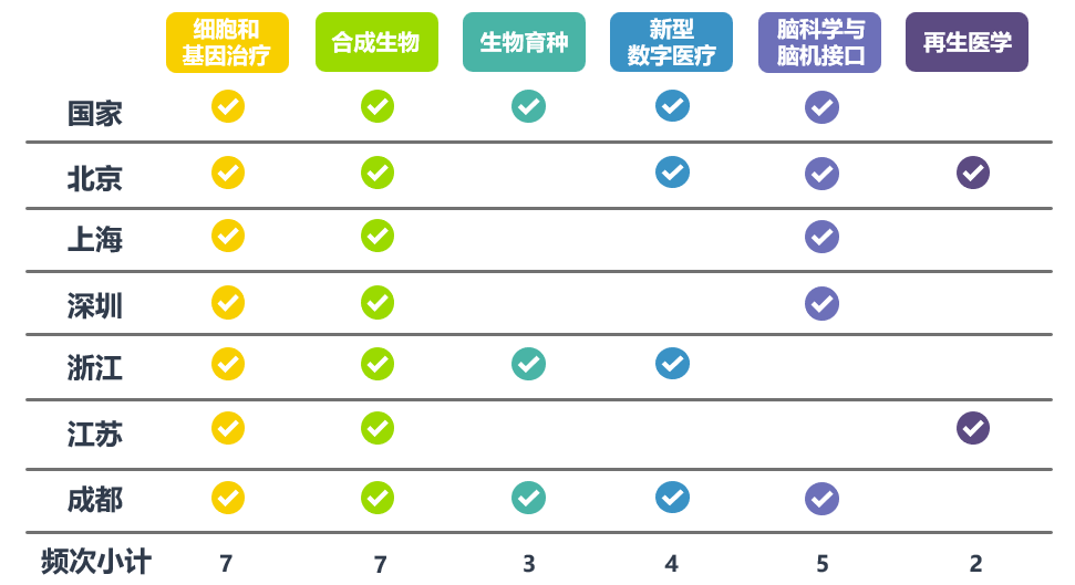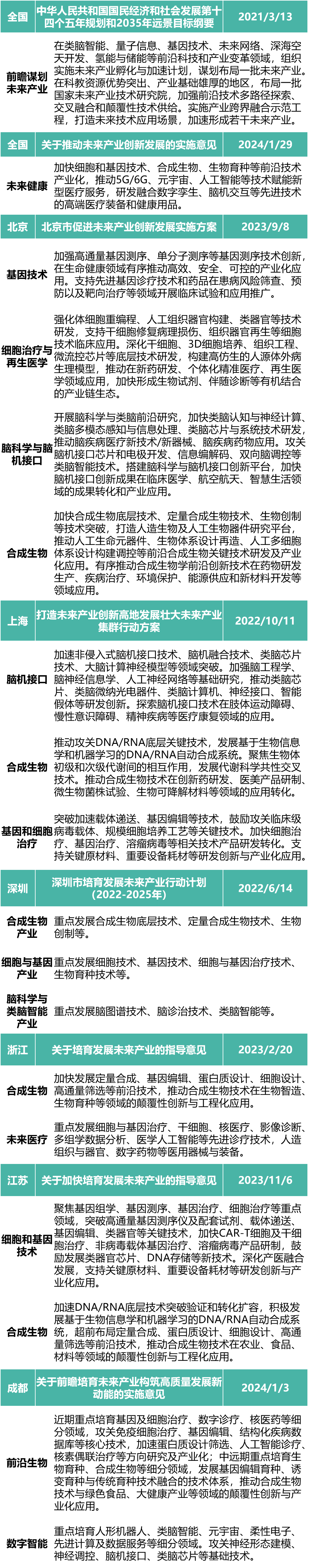 自國家“十四五”規(guī)劃綱要提出要前瞻謀劃未來產(chǎn)業(yè)以來,各地高度重視并加快未來產(chǎn)業(yè)的系統(tǒng)謀劃與前瞻布局。北京、上海、成都、浙江、江蘇等地陸續(xù)出臺了相關(guān)指導(dǎo)意見、行動方案(詳見附表)。圍繞未來健康產(chǎn)業(yè),均提出了要加快布局細(xì)胞與基因治療、合成生物學(xué)等領(lǐng)域新賽道。部署重點(diǎn)領(lǐng)域情況如下: