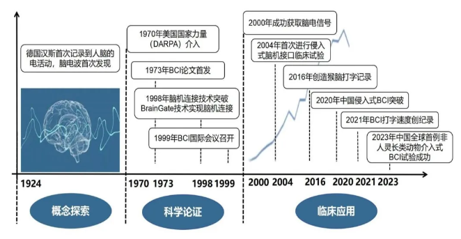 腦機接口在醫(yī)療領(lǐng)域的應(yīng)用是其發(fā)展的第一推動力,目前主要經(jīng)歷了概念探索、科學(xué)論證和臨床應(yīng)用3個階段。1924年,腦電波的首次發(fā)現(xiàn)為大腦研究奠定了基礎(chǔ)。1970年,美國組建團隊開始進行腦機接口相關(guān)研究,各國團隊也相繼開展探索,實現(xiàn)了刺激范式、腦機連接等技術(shù)突破。進入21世紀(jì)后,隨著科學(xué)論證的不斷完善、神經(jīng)科學(xué)與相關(guān)技術(shù)的不斷突破,各國紛紛開展腦機接口的戰(zhàn)略布局,侵入式BCI技術(shù)和非侵入式BCI技術(shù)都有了較大的進展,如2004年實現(xiàn)了通過侵入式腦機接口控制機械臂,2019年非侵入式解碼器將大腦信號轉(zhuǎn)化為語音信號。相關(guān)專利量、論文發(fā)表量呈現(xiàn)爆發(fā)性增長,涌現(xiàn)了Neuralink等一批初創(chuàng)公司,概念應(yīng)用產(chǎn)品相繼推出。此外,隨著認知/協(xié)同BCI等新范式的不斷涌現(xiàn),其應(yīng)用也從臨床醫(yī)學(xué)向娛樂游戲、汽車等多元化領(lǐng)域拓展,逐漸形成產(chǎn)業(yè)化趨勢。