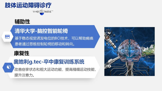 當(dāng)前的研究和應(yīng)用多為非侵入式,主要分為輔助性和康復(fù)性兩類,是業(yè)界進展相對較快的領(lǐng)域。輔助性BCI著重于替代或增強物理功能,通過捕捉患者的運動意圖,進而控制外部設(shè)備如假肢或外骨骼等。康復(fù)性BCI則專注于通過神經(jīng)康復(fù)訓(xùn)練恢復(fù)或改善患者的運動能力,利用中樞神經(jīng)系統(tǒng)的可塑性,通過重復(fù)性刺激來強化神經(jīng)元之間的突觸連接,促進修復(fù)。