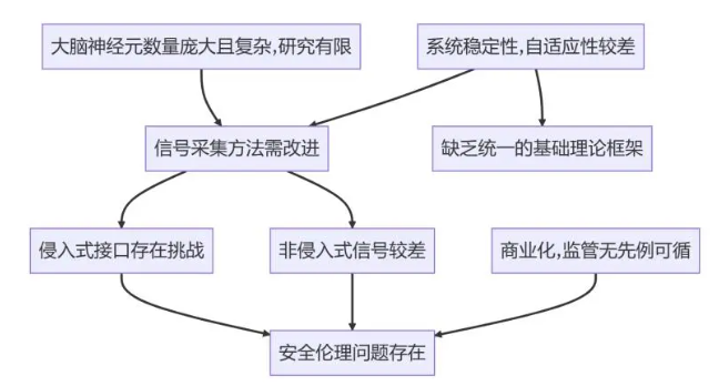 技術(shù)上仍有諸多局限性。BCI系統(tǒng)在信號采集、識別精度、處理速度、系統(tǒng)穩(wěn)定性和自適應(yīng)性方面仍存在不足。大腦的神經(jīng)元結(jié)構(gòu)極為復(fù)雜,對大腦工作機制和反饋刺激的研究還相對有限。人機交互界面操作復(fù)雜、訓(xùn)練周期長,針對不同患者的定制化研究難題亟待攻克。研發(fā)成本高昂、開發(fā)周期長,技術(shù)成熟度和產(chǎn)品化仍有較長距離。