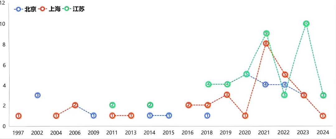 圖4 北京、上海、江蘇獲批上市創(chuàng)新藥的年份分布情況