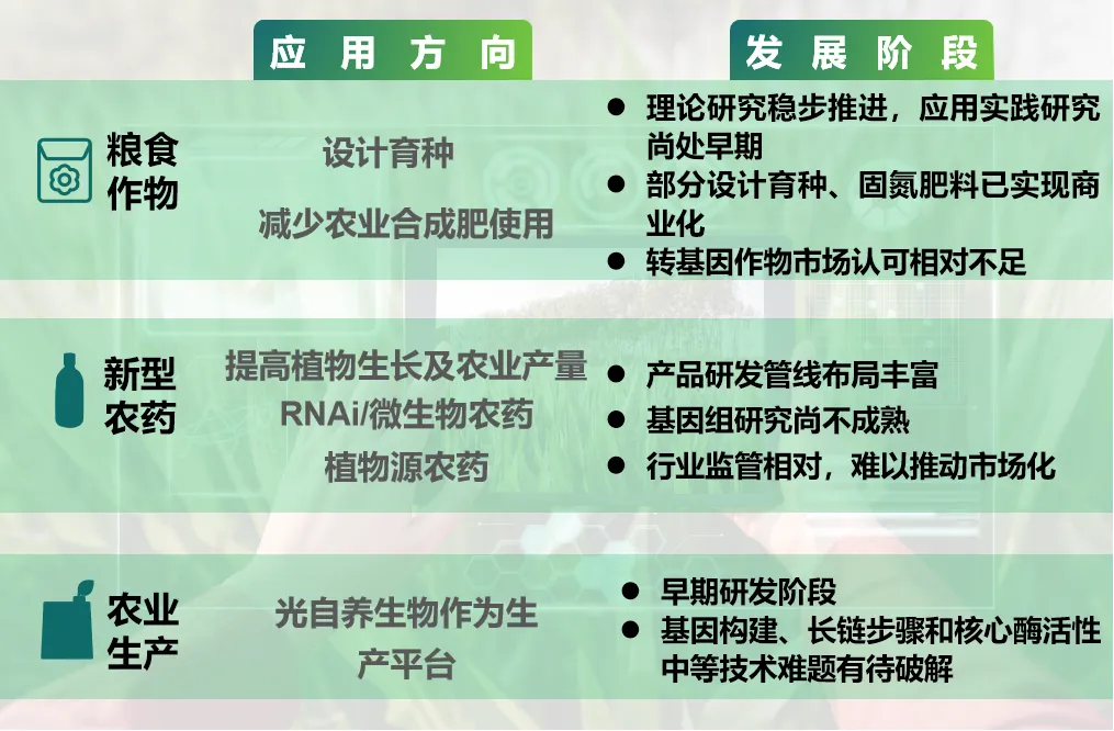 圖2 合成生物技術(shù)農(nóng)業(yè)應(yīng)用方向及發(fā)展階段