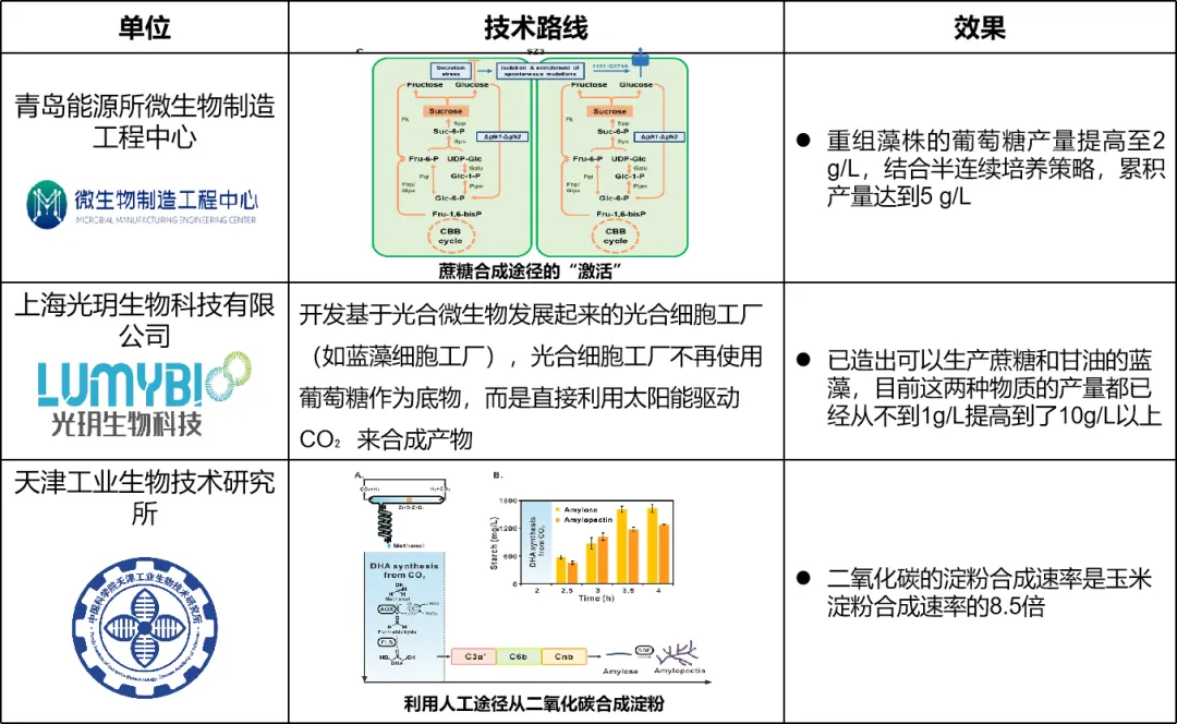 目前國內(nèi)已有團(tuán)隊(duì)在該領(lǐng)域取得研究進(jìn)展,如青島能源所微生物制造工程中心實(shí)現(xiàn)藍(lán)細(xì)菌直接利用二氧化碳合成葡萄糖;上海光玥生物科技有限公司改造出可以生產(chǎn)蔗糖和甘油的藍(lán)藻;天津工業(yè)生物技術(shù)研究所成功實(shí)現(xiàn)從二氧化碳到淀粉的人工合成,但基本都還處于實(shí)驗(yàn)室概念驗(yàn)證階段。