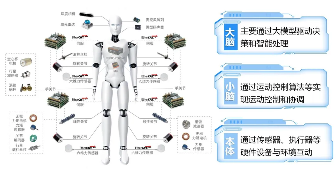 具身智能在架構上可以分為“大腦”“小腦”和“本體”。依托三者協(xié)同配合,機器人才能像人類一樣去面對各項需求,完成各類任務。其中,“大腦”主要通過大模型驅動決策和智能處理;“小腦”通過運動控制算法等實現(xiàn)運動控制和協(xié)調;“本體”通過傳感器、執(zhí)行器、靈巧手等硬件設備實現(xiàn)與環(huán)境互動。