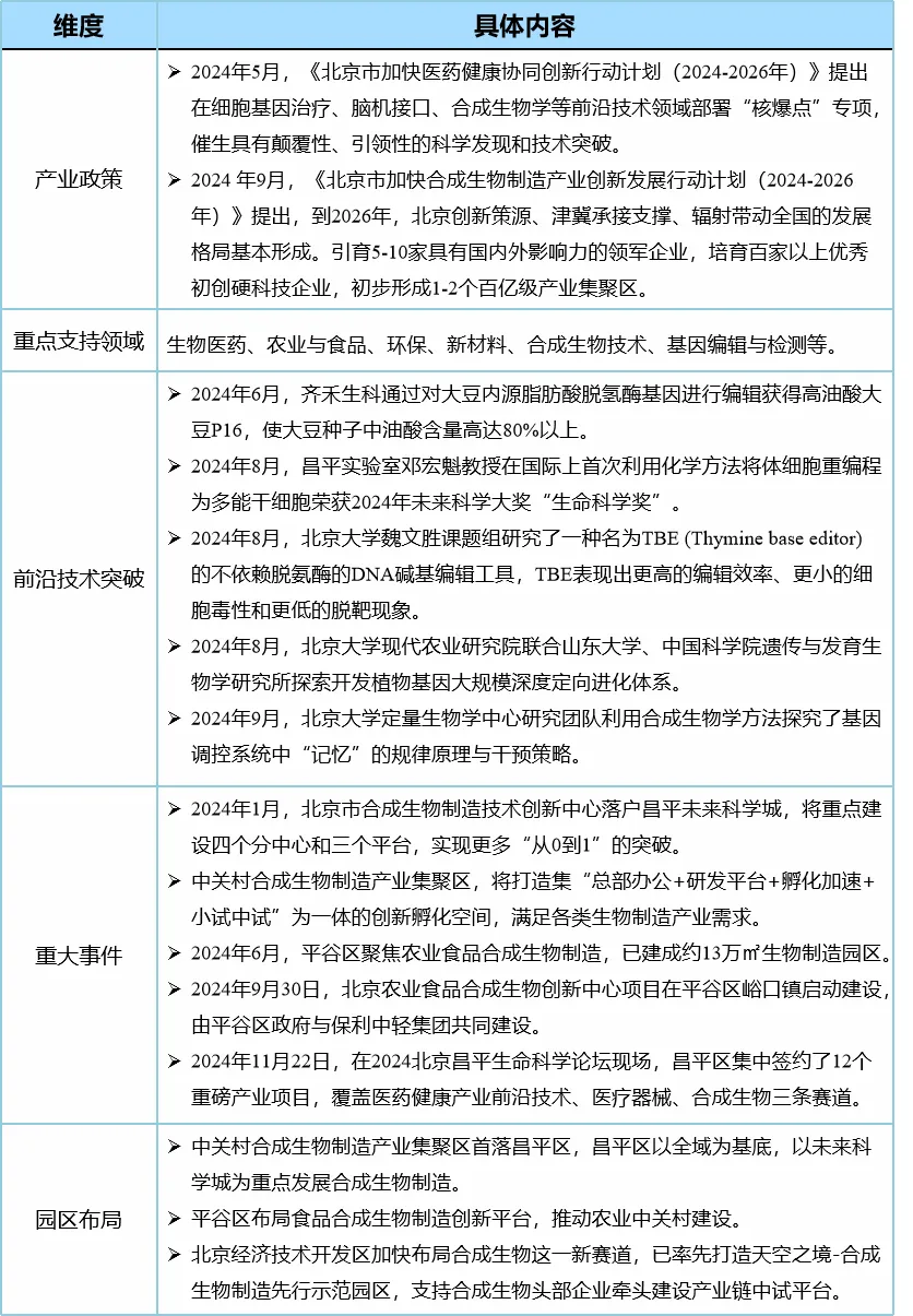 加強頂層謀劃,統(tǒng)籌部署關(guān)鍵任務(wù)。2024年5月,北京市明確提出要在合成生物學(xué)、細胞基因治療等前沿技術(shù)領(lǐng)域部署“核爆點”專項。同年9月,發(fā)布了北京市首個合成生物制造產(chǎn)業(yè)的專項行動計劃,并配套出臺落實具體支持形式的若干措施,提出到2026年要基本形成北京創(chuàng)新策源、津冀承接支撐、輻射帶動全國的發(fā)展格局,打造1-2個百億級產(chǎn)業(yè)集聚區(qū)。