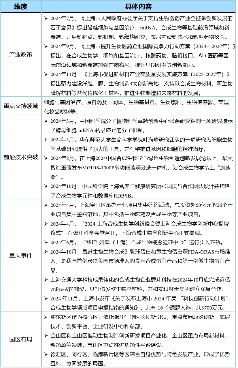 推動優(yōu)勢前沿領(lǐng)域國際化發(fā)展。2024年10月,上海在《上海市提升生物醫(yī)藥企業(yè)國際競爭力行動方案(2024—2027年)》中提出圍繞合成生物學(xué)、細胞和基因治療等國際前沿生物技術(shù)領(lǐng)域和新賽道開展前瞻布局,對標(biāo)國際標(biāo)準(zhǔn)和規(guī)范,開發(fā)面向國際市場的優(yōu)質(zhì)創(chuàng)新產(chǎn)品。2024年11月,出臺新材料產(chǎn)業(yè)實施方案支持合成生物材料替代傳統(tǒng)化工材料,支持優(yōu)先布局CO2制備生物燃料、生物基高分子材料等產(chǎn)業(yè)化項目。