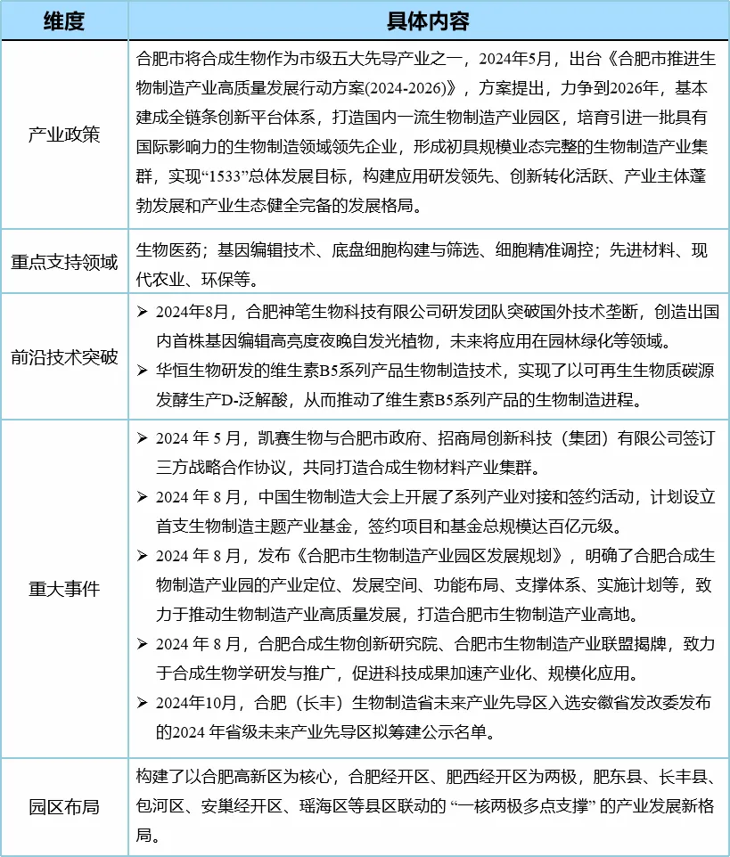政府為合成生物企業(yè)發(fā)展搭臺。通過與凱賽生物、保利集團等企業(yè)簽訂協(xié)議或基金合作項目,推動科研成果從“實驗室”走向“應(yīng)用場”,加速推進合成生物制造項目落地。此外,合肥市人民政府聯(lián)合其他單位主辦2024中國生物制造大會,現(xiàn)場開展了系列產(chǎn)業(yè)對接和簽約活動,擬設(shè)立首支生物制造主題產(chǎn)業(yè)基金,計劃簽約項目和基金總規(guī)模達百億元級。作為首屆中國生物制造大會,體現(xiàn)出合肥市在發(fā)展生物制造產(chǎn)業(yè)領(lǐng)域的決心與魄力。
