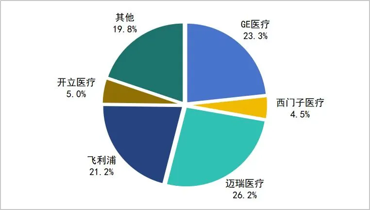 我國US市場(chǎng)規(guī)模約180億元,GE醫(yī)療(26%)、邁瑞醫(yī)療(24%)、飛利浦(24%)三家企業(yè)合計(jì)占據(jù)市場(chǎng)75%以上份額。隨著設(shè)備更新落地,國產(chǎn)品牌市場(chǎng)份額占比明顯提升,截至2024年三季度,US國產(chǎn)品牌占比提升至41%(邁瑞醫(yī)療26%、開立醫(yī)療5%,其他10%),GE醫(yī)療、飛利浦分別下降至23%、21%,預(yù)計(jì)2024年第四季度以及2025年上半年,隨著邁瑞醫(yī)療、開立醫(yī)療等企業(yè)參與更多設(shè)備更新采購,國產(chǎn)品牌市場(chǎng)份額將進(jìn)一步快速提升。