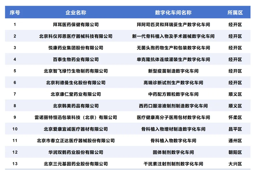 表1 2022—2024年北京市生物醫(yī)藥領(lǐng)域數(shù)字化車間認(rèn)定名單