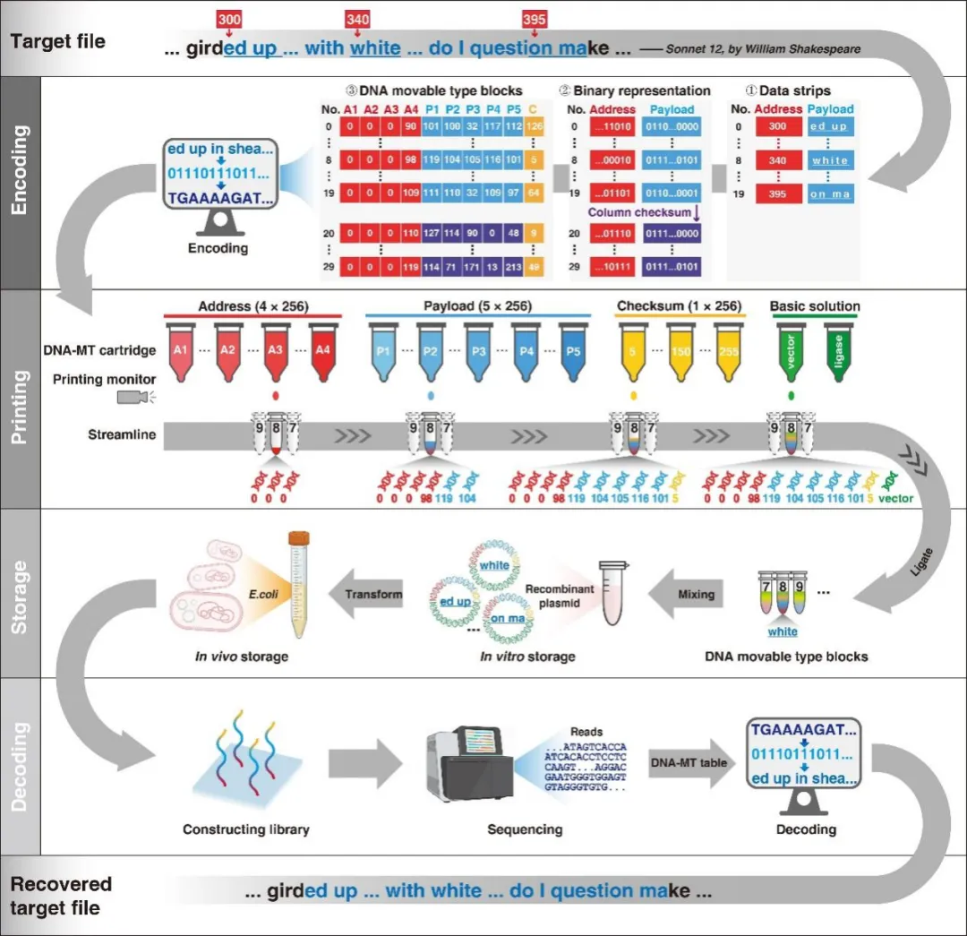 快速迭代階段——技術(shù)革新與成本優(yōu)化。2025年,麻省理工學(xué)院的研究團(tuán)隊(duì)研發(fā)出一種新型聚合物材料,能夠在室溫環(huán)境下實(shí)現(xiàn)DNA的長(zhǎng)期穩(wěn)定保存。同年,中國(guó)科學(xué)院北京基因組研究所(國(guó)家生物信息中心)等單位科研人員提出了一種經(jīng)濟(jì)高效的存儲(chǔ)方法——DNA活字噴墨打印機(jī)“畢昇一號(hào)”。該技術(shù)以預(yù)制短DNA片段為存儲(chǔ)單元,每個(gè)片段存1字節(jié)信息,通過(guò)酶連接組裝成DNA活字塊,類似于畢昇印刷術(shù)的“活字重組邏輯”,通過(guò)標(biāo)準(zhǔn)化預(yù)制片段的靈活拼接實(shí)現(xiàn)信息的高效存儲(chǔ)與組合。“畢昇一號(hào)”成功實(shí)現(xiàn)各類數(shù)字文件的高效存儲(chǔ)與精準(zhǔn)還原,解碼準(zhǔn)確率達(dá)100%,并且無(wú)需從頭合成DNA序列進(jìn)行編碼,將DNA活字存儲(chǔ)成本降至122美元/MB(主流DNA存儲(chǔ)3500美元/MB),推動(dòng)DNA存儲(chǔ)技術(shù)邁向?qū)嵱没?/p>